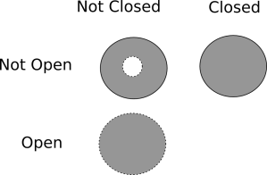 Beware! It is easy to fall into the beginner’s trap of believing that a set must be either open or closed. In fact, these two properties are completely independent from one another; a set can be open, closed, both or even none-of-the above. For example, both and the empty set are examples of clopen sets (that is they are closed and open). To help explain some of the differences, I made a table with some pictures: